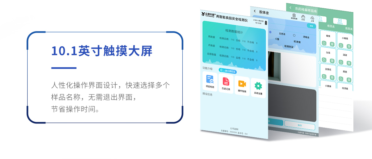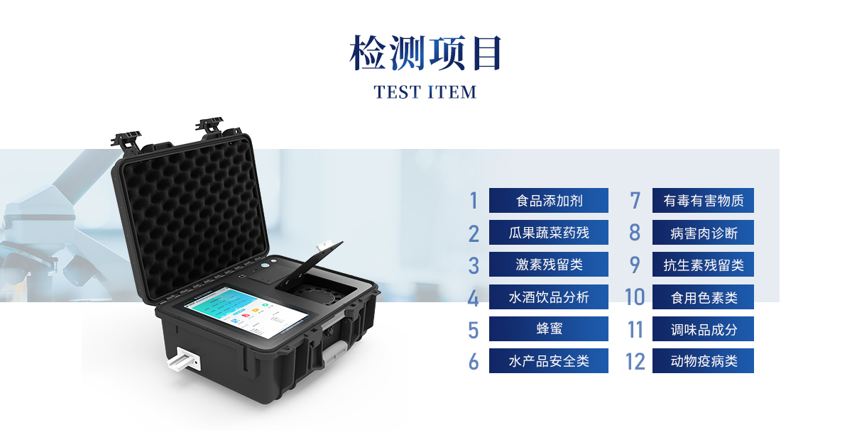 山東云唐智能科技有限公司生產(chǎn)的高智能食品安全檢測儀可快速檢測200多種食品安全項目,包含非食用化學物質(zhì)、濫用食品添加劑、農(nóng)藥殘留、獸藥殘留、重金屬、病害肉、營養(yǎng)強化劑、抗生素類殘留、激素類殘留、真菌毒素類殘留、化學類殘留等項目的定性定量檢測。
